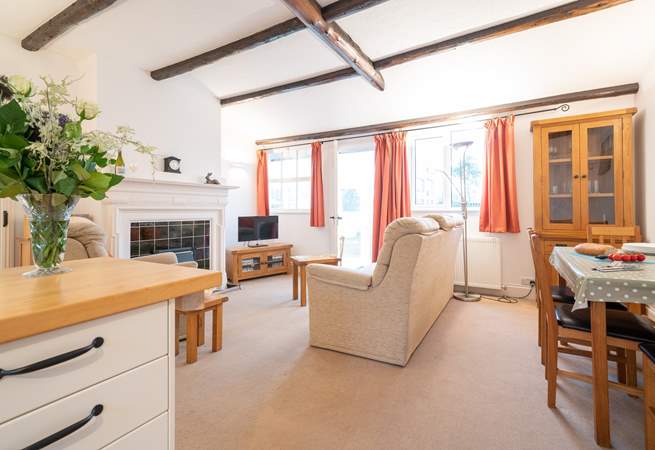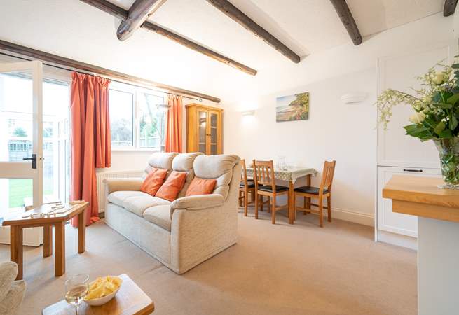 Open plan living and dining room, door to conservatory with chairs