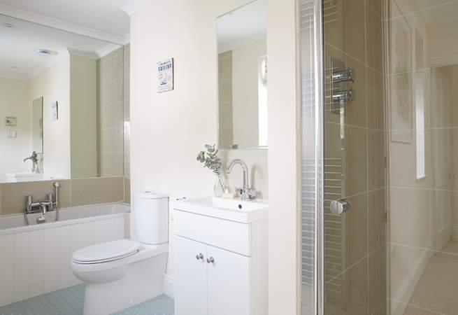1x bathroom with bath, shower attachment, shower cubicle, WC and wash-basin